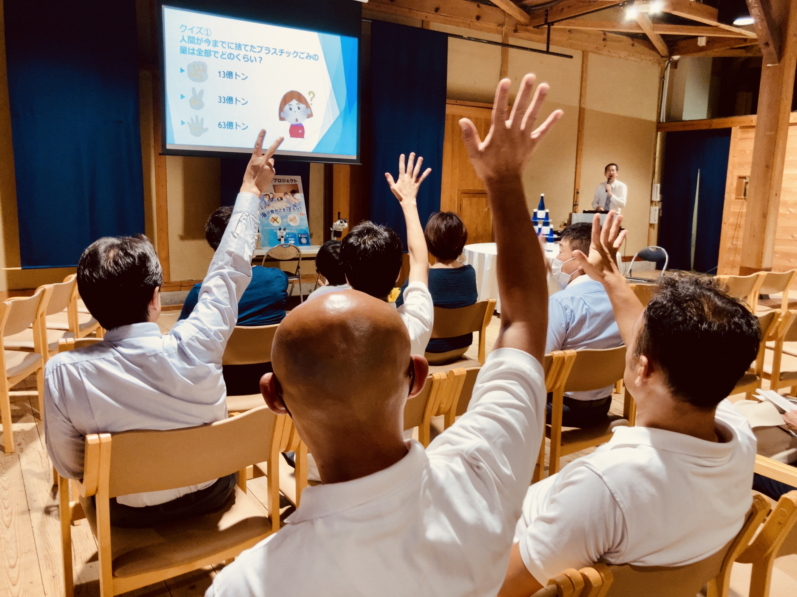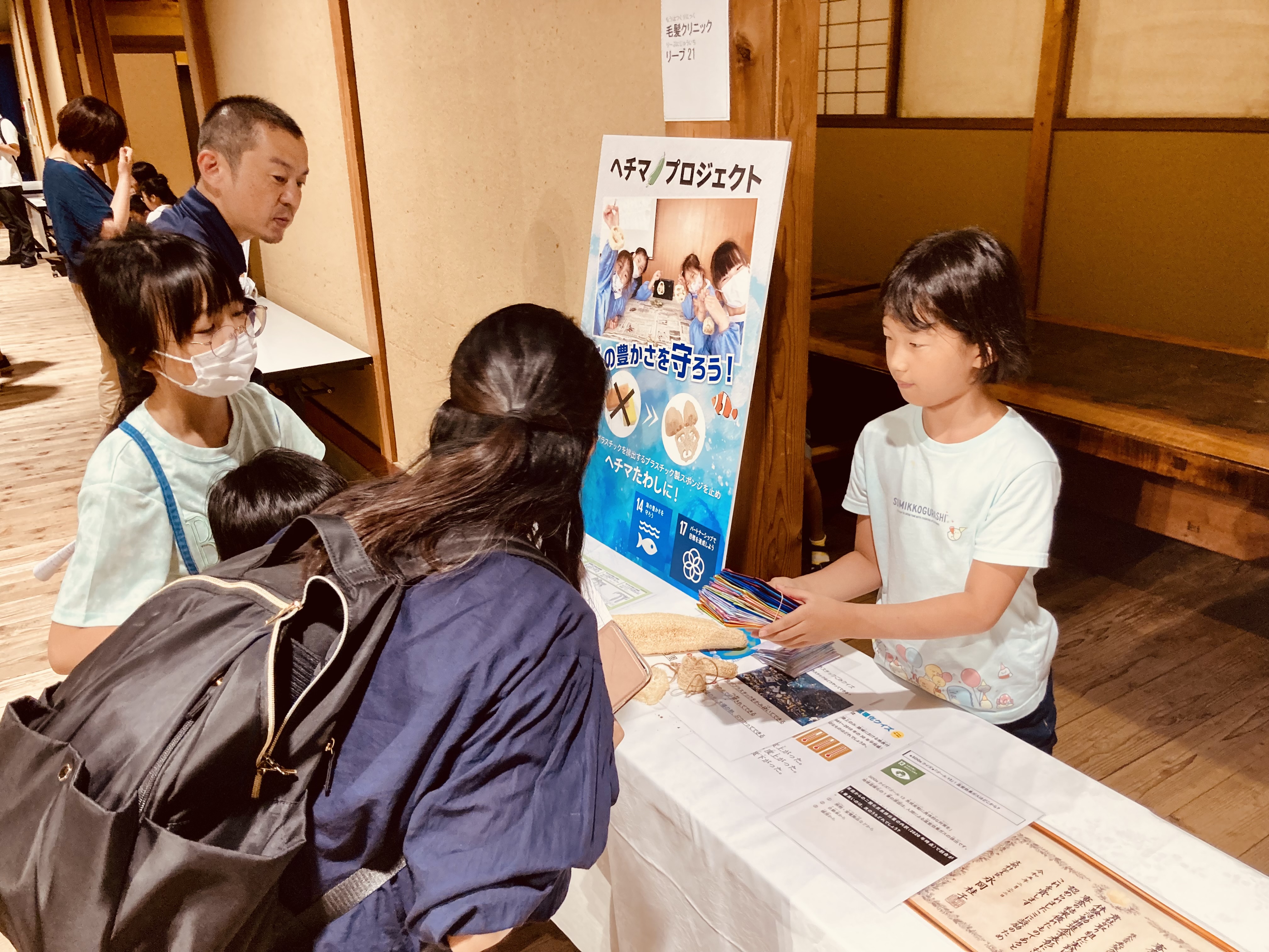 リーブ21のSDGs14「海の豊かさを守ろう」特別セミナーでは、家庭の排水口から流出するマイクロプラスチックによる環境汚染や、子供達が生産するヘチマを使った植物スポンジを保護者に使っていただくプロセスなど環境クイズを交えて説明しました。