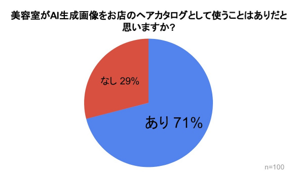 「美容院がAI生成画像をお店のヘアカタログとして使うことはありだと思いますか?」のアンケート調査を行ったところ、『あり』が71%と肯定派が多い結果となりました。