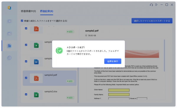 手順3:ファイルの修復が完了すると、修復されたファイルをプレビューして、指定した場所に保存できます。