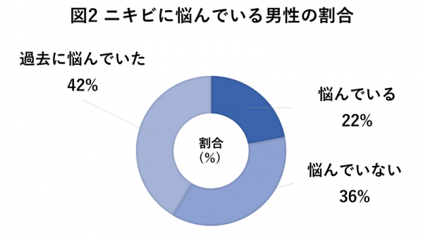 ニキビに悩まされている男性の割合について調査を行ったところ、現に悩んでいる方は22%、過去に悩んでいた男性は42%みられました。