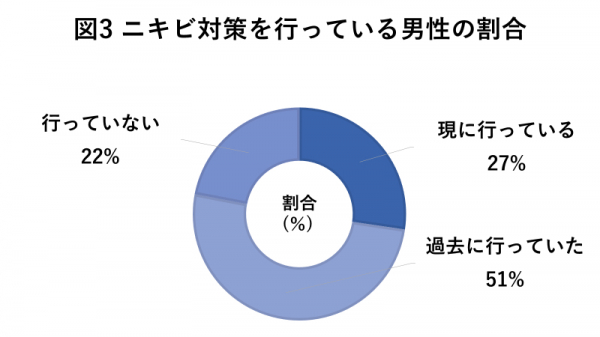 現に行っている男性は27%、過去に行っていた男性は51%みられ、およそ8割の男性がこれまで何かしらのニキビ対策を行っていることが明らかとなりました。
