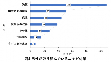 続いて、「睡眠時間の確保」がニキビ対策として多く取り組まれていました。ニキビ対策のため、市販薬やタバコを控える男性についてはあまりいないようです。
