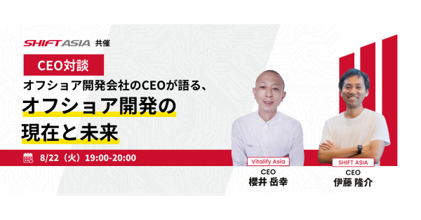 顧客のDX化を総合的に支援するバイタリフィ(東京都渋谷区、代表取締役:川勝潤治)と子会社 Vitalify Asia(本社:ベトナム国ホーチミン市、CEO:櫻井岳幸)は、ベトナムでソフトウェア開発およびソフトウェアテストサービスを提供するSHIFT ASIA(本社:ベトナム国ホーチミン市、CEO:伊藤 隆介)と共催で、2023年8月22日(火)に「【CEO対談】オフショア開発会社のCEOが語る、オフショア開発の現在と未来」と題した無料セミナー(オンライン・オフライン同時開催)を開催することをお知らせいたします。