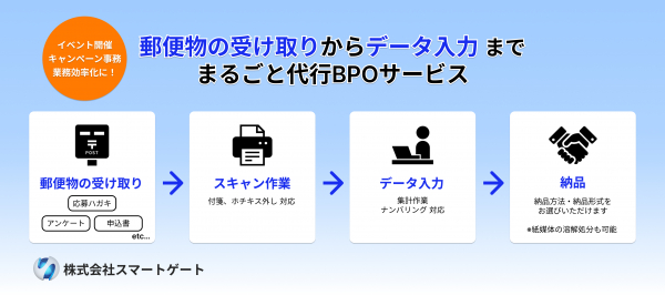 株式会社スマートゲート(本社:東京都豊島区、代表取締役:後藤康宏、以下スマートゲート)は、2023年8月30日、郵便物の受け取りから仕分け、集計、データ入力をまるごと代行するBPOサービスの提供を開始いたします。