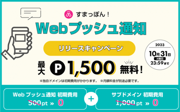 今回WEBプッシュ通知の搭載を記念して、10月末まで、WEBプッシュ通知初期費用 500円(ポイント)を無料に、さらにサブドメインの設定費用1,000円(ポイント)を無料といたします。したがって、サブドメインは、初期費用無料、月額利用料1,000円(ポイント)でご利用いただけます。(独自ドメインは、初期費用1,000円、月額利用料1,000円)この機会に、お試しいただければ幸いです。お試しはサブドメインがおすすめです!