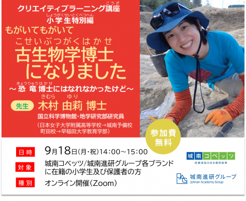 株式会社城南進学研究社(本社:神奈川県川崎市、代表取締役社長CEO:下村勝己、以下「当社」)は、2023年9月18日(月・祝)、新しい価値観・世界観を創造する力を鍛える「クリエイティブラーニング講座」を開催。通常は中高生対象のところ、今回は小学生特別編として国立科学博物館・地学研究部研究員の木村由莉さんをお招きし、オンライン講座『もがいてもがいて古生物学博士になりました~恐竜博士にはなれなかったけど~』を実施します。