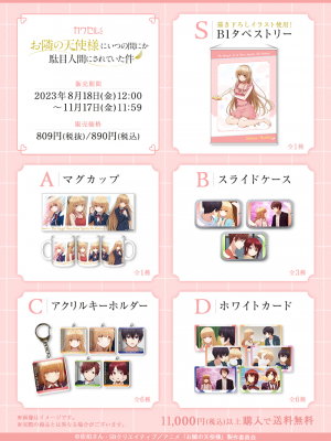 S賞は夏らしい「真昼」の水着姿の描き下ろしイラストを使用したB1タペストリーです。A賞からD賞も作中から印象的なシーンを選定しております。是非『お隣の天使様にいつの間にか駄目人間にされていた件』の世界観をお楽しみください!