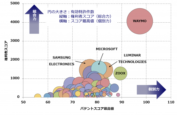 1位 WAYMOはAlphabet傘下の企業で、権利者スコアが2位以下を大きく引き離しています。同社の注目度の高い特許には、「車外の対象物を検知して状態を決定し、挙動を予測する技術」などが挙げられ、デバイスとしてのLIDARではなく、LIDARを用いた自動運転システムが多く見られます。