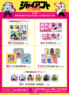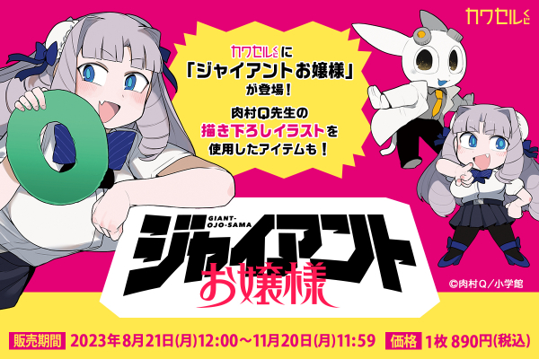侵略者から大切な街を守るために、巨大化するお嬢様の姿を描いた巨大娘コメディー「ジャイアントお嬢様」が「カワセルくじ」限定の描き下ろしイラストで販売開始です!S賞とD賞は肉村Q先生の描き下ろしイラストを使用したデザインで、ファンならば絶対手に入れたいデザインとなっております!「カワセルくじ」でしか手に入らないラインナップとなりますので、是非コンプリート目指して回してみてください!