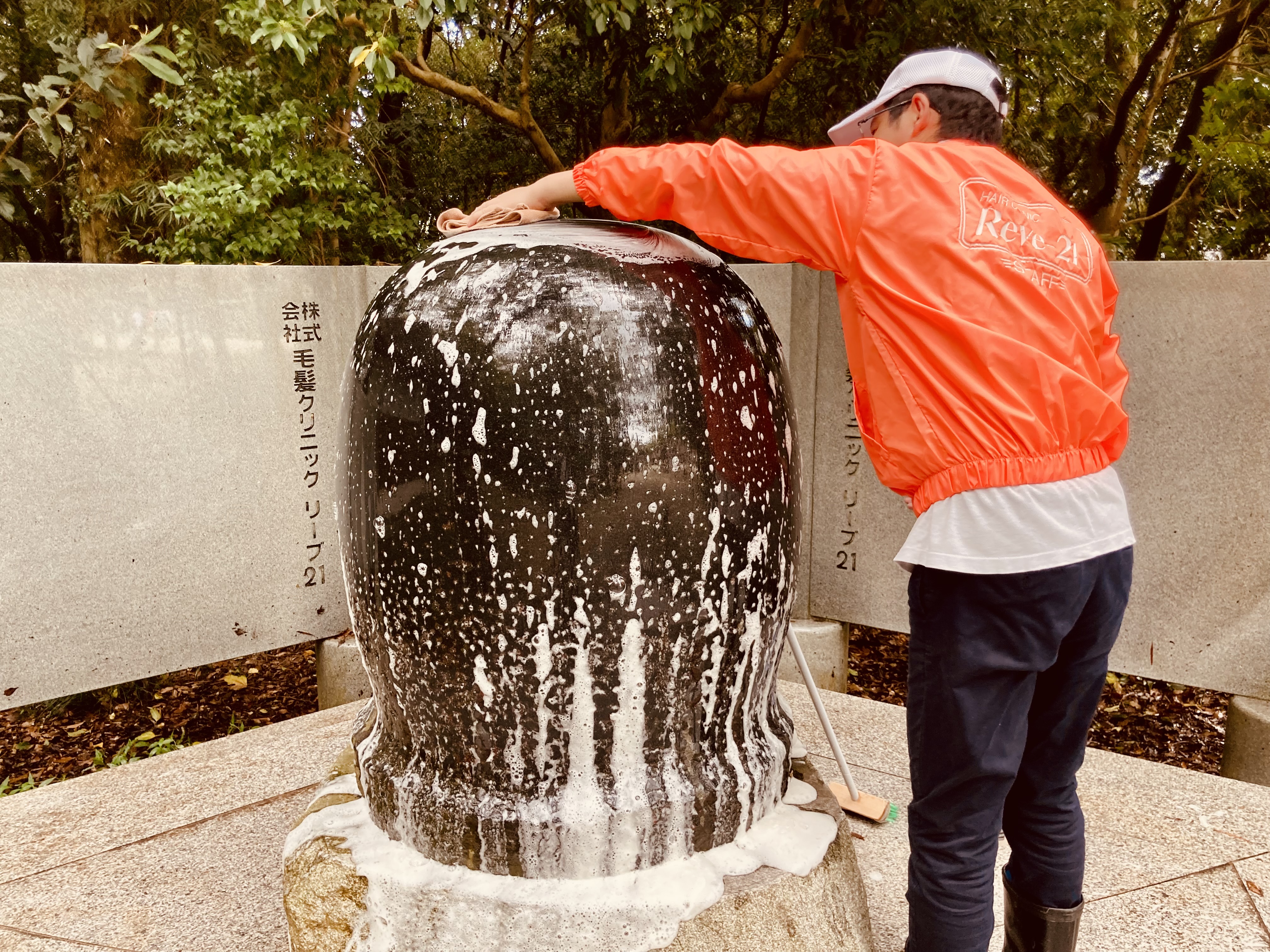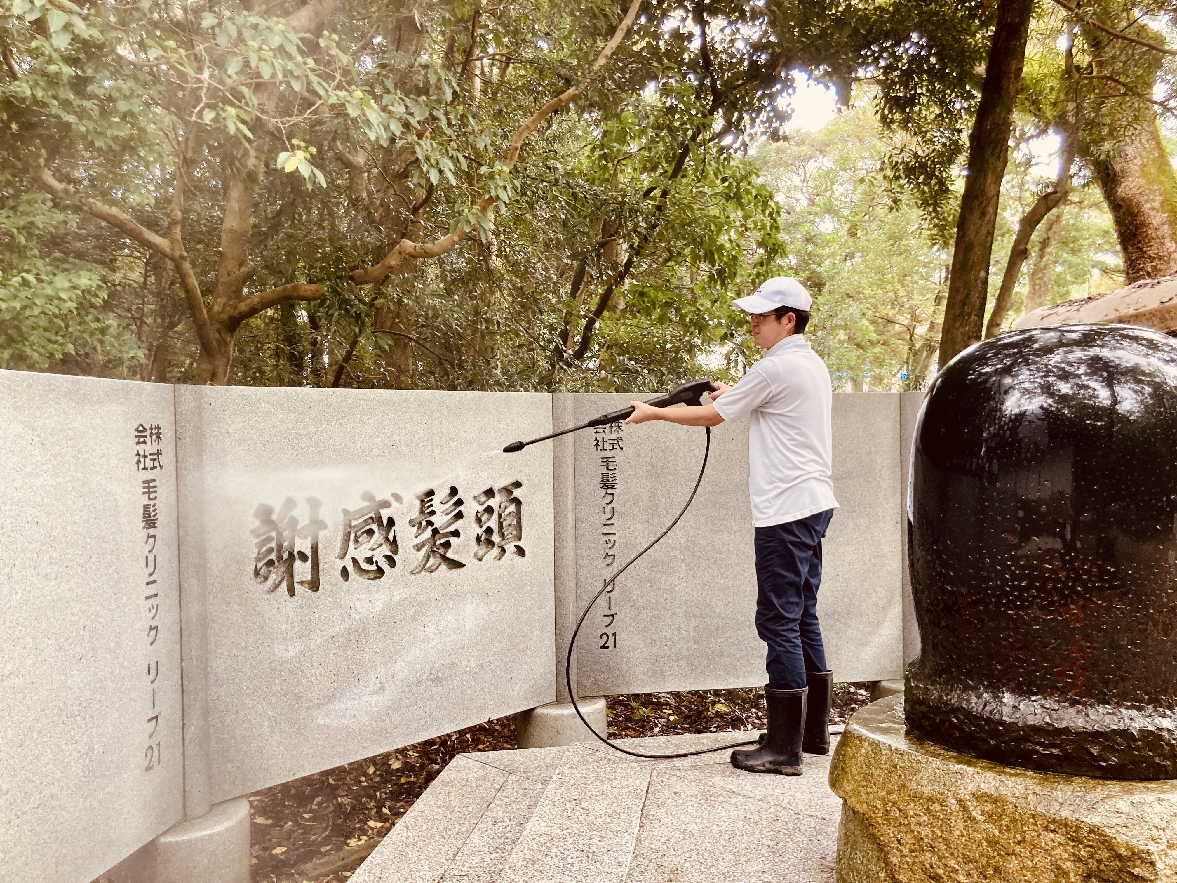 リーブ21は、創業47周年を迎えることを記念し、伊弉諾神宮の境内にある「頭髪感謝碑」※を自社製品(アクティーシャンプーR)で入念にシャンプー清掃させていただきました。