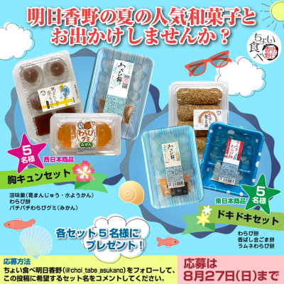 今回のキャンペーンでは明日香野夏の人気和菓子のセットを東西2種から選んでいただき、抽選で各セット5名様にプレゼントいたします。