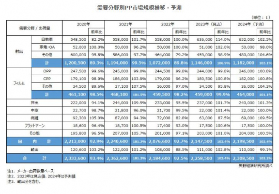 2023年のPP市場規模は前年比103.4%の225万8,500tを見込む。2023年は半導体不足の解消に伴う自動車挽回生産による需要の回復に加え、人流回復による消費の持ち直しやインバウンド(訪日外国人客)需要の増加が期待されており、PP出荷量は増加に転じる見込みである。