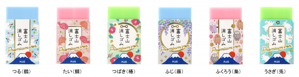 “お守り”の形を紙箱で表現したパッケージには、縁起の良い「つる(鶴)」、「たい(鯛)」、「つばき(椿)」、「ふじ(藤)」、「ふくろう(梟)」、「うさぎ(兎)」のモチーフをそれぞれあしらった6種類のラインアップ。合格祈願にぴったりのデザインです。消しゴム本体の樹脂色には「晴れ富士(はれふじ)」「花咲富士(はなさきふじ)」「若葉富士(わかばふじ)」の新色を採用しました。さらに今回は、富士山をこれまでの2層カラーから、3層カラーで表現した初のプレミアムバージョン。よりリアルな富士山を作ることができます。