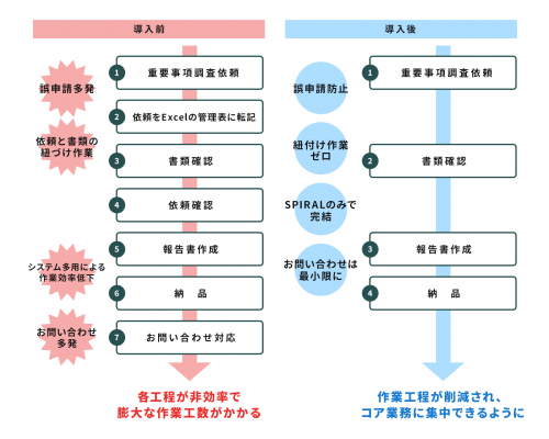 デジタルで未来最適をリードするスパイラル株式会社(東京都港区、代表取締役CEO 佐谷 宣昭、以下「スパイラル」)は、株式会社東急コミュニティー(東京都世田谷区、代表取締役社長 木村 昌平、以下「東急コミュニティー」)へ、マンション管理業務効率化の一助となる「重要事項調査依頼受付管理システム」を提供しました。その結果、月間約2,200件の受付および管理における事務作業工数を月間425時間、人月にして2.6人工/月 削減し、業務にかかる負担を大きく改善いたしました。このたび、導入インタビュー記事を2023年8月28日に公開しましたので、お知らせいたします。なお、本システムはローコード開発プラットフォーム「SPIRAL ver. 1(スパイラル バージョン1)」で構築しています。