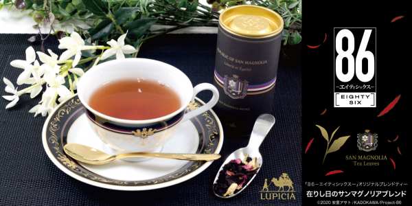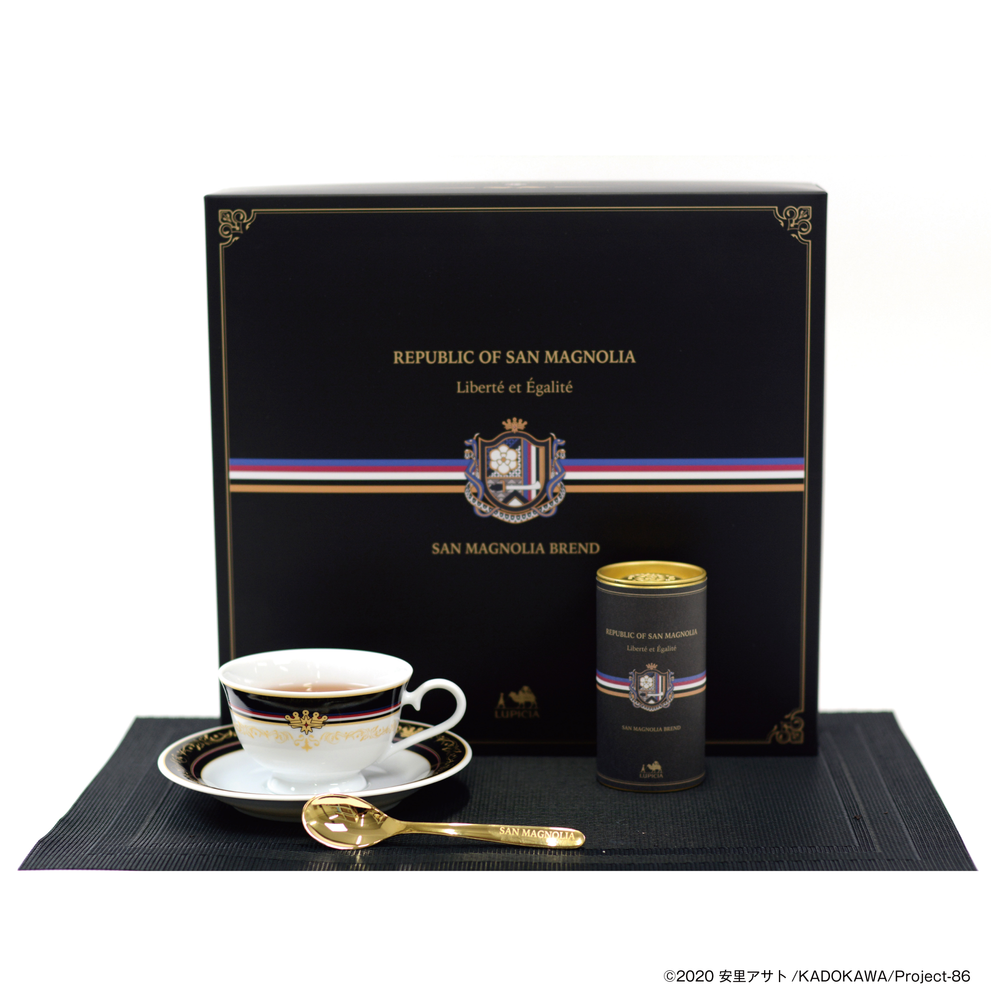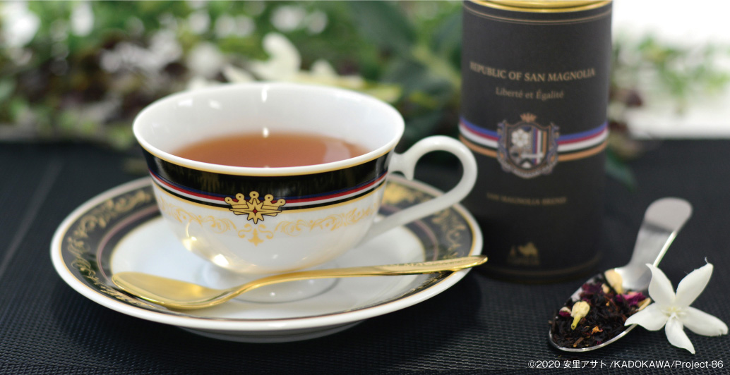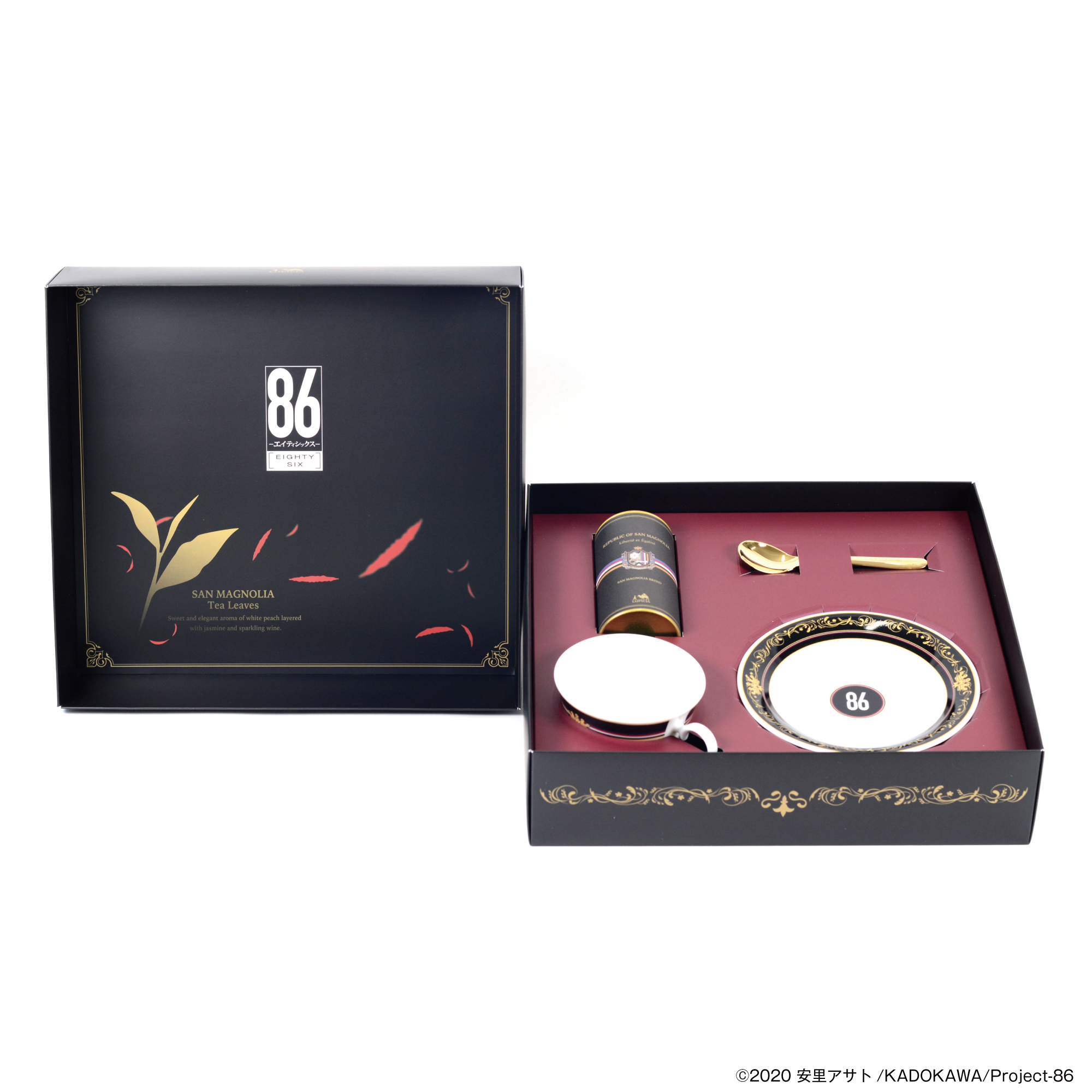 TVアニメ 『86―エイティシックス―』オリジナルブレンドティー『在りし日のサンマグノリアブレンド』は、安里先生全面監修の元、甘く上品に香る白桃にジャスミンとスパークリングワインの香りを重ねた紅茶で、サンマグノリア共和国にかつて存在したであろう幻の茶葉をイメージしました。オリジナルラベルのLUPICIA缶に30g入れとなっております。他、オリジナルデザインのティーカップ、ソーサー、ティースプーンを付属し、オリジナルデザインBOXへのセット内容となります。ティーカップ、ソーサー、ティースプーン、BOX共に国産品で、ティースプーンは新潟燕三条ブランドとなっております。