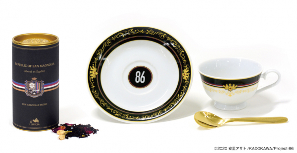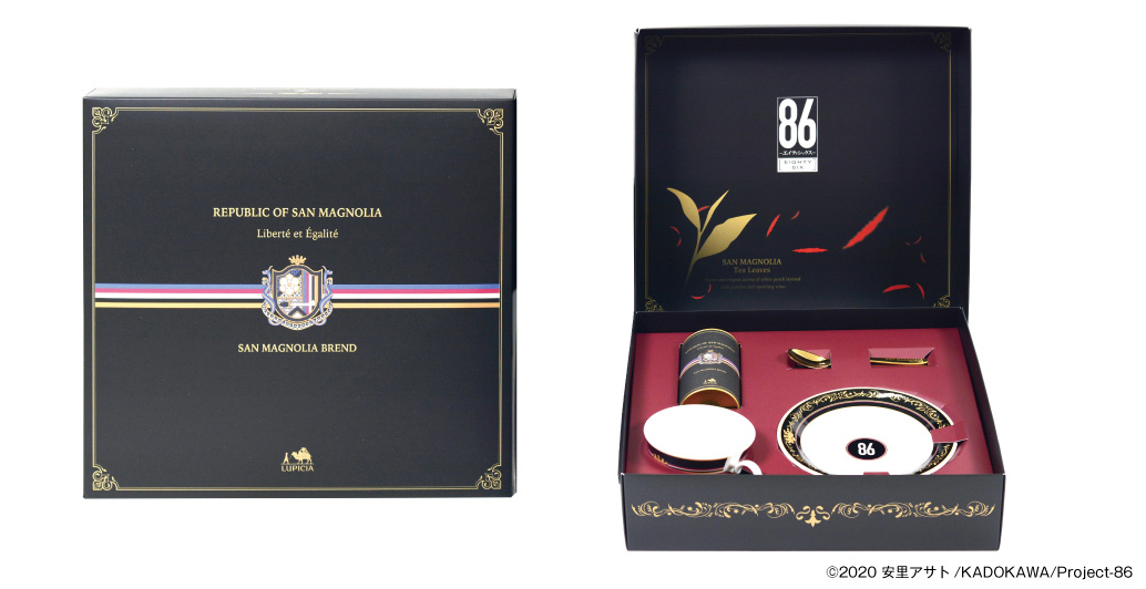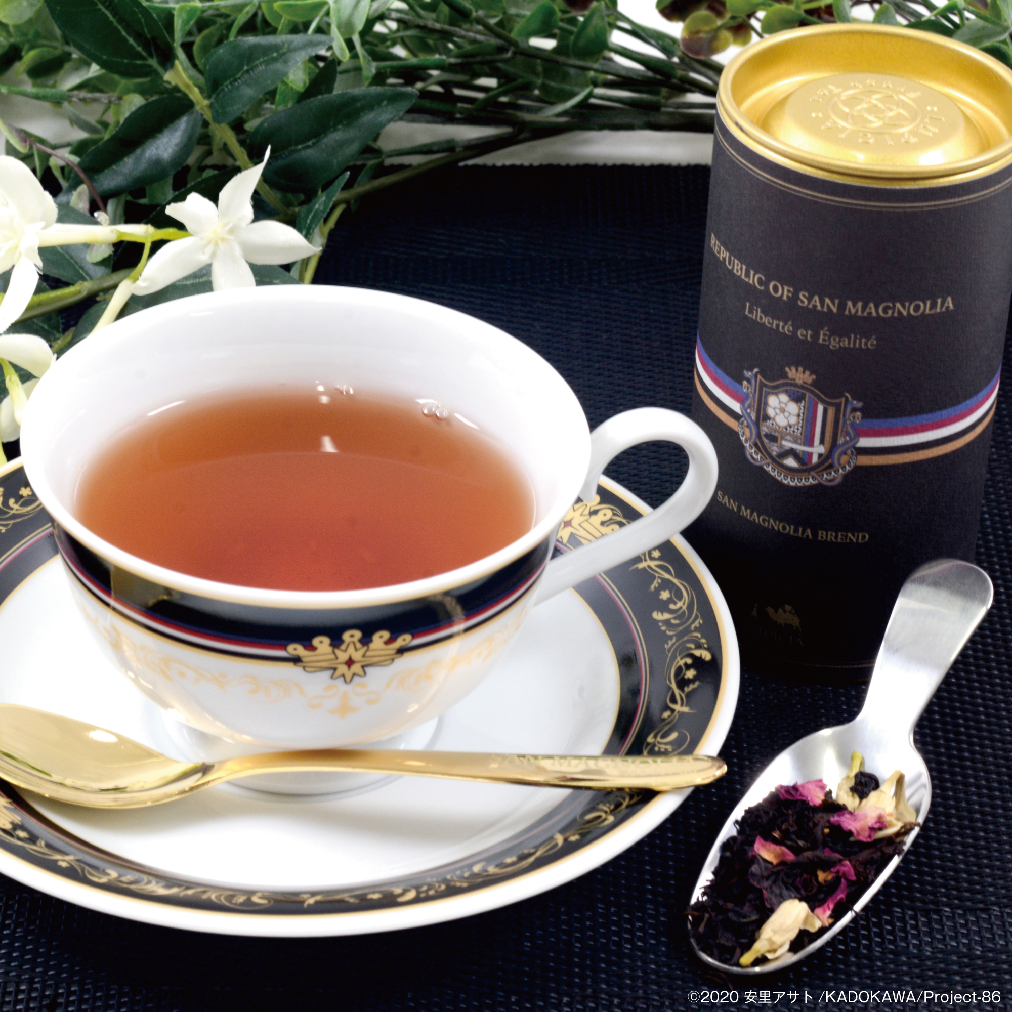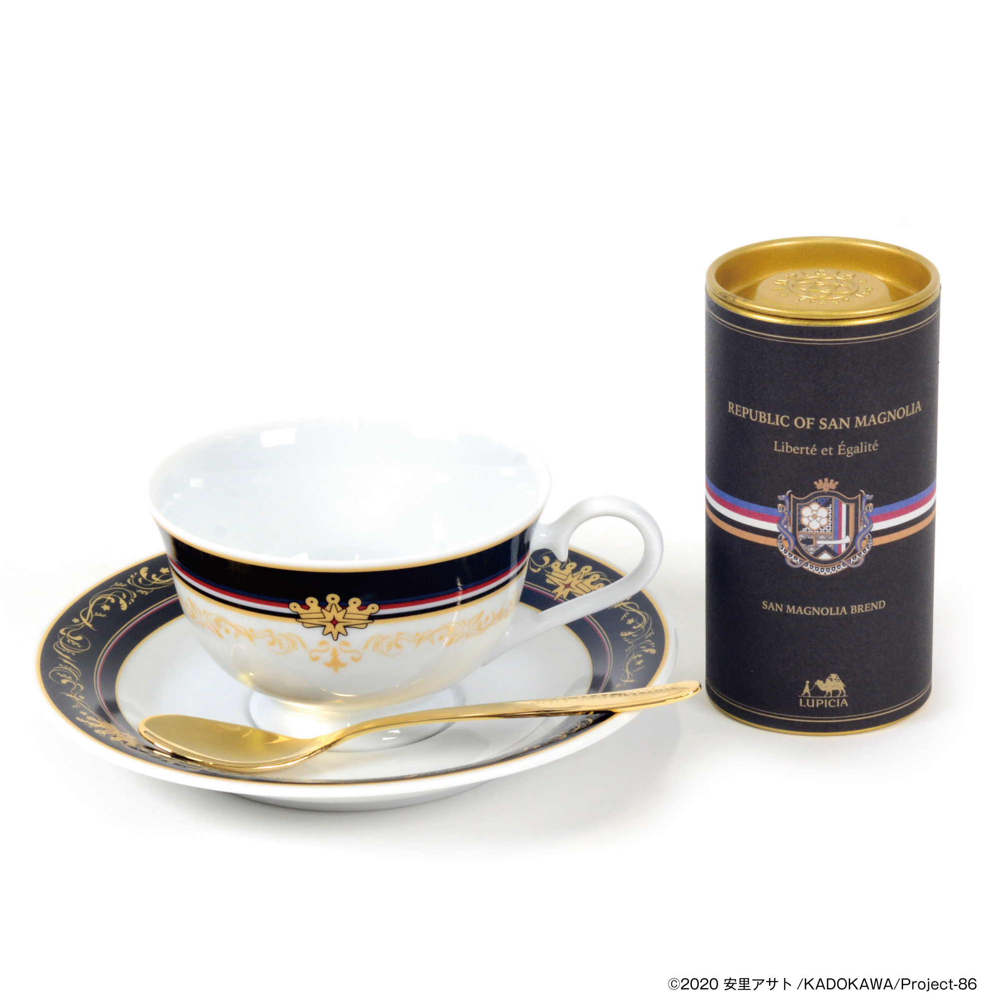 TVアニメ 『86―エイティシックス―』オリジナルブレンドティー『在りし日のサンマグノリアブレンド』は、安里先生全面監修の元、甘く上品に香る白桃にジャスミンとスパークリングワインの香りを重ねた紅茶で、サンマグノリア共和国にかつて存在したであろう幻の茶葉をイメージしました。オリジナルラベルのLUPICIA缶に30g入れとなっております。他、オリジナルデザインのティーカップ、ソーサー、ティースプーンを付属し、オリジナルデザインBOXへのセット内容となります。ティーカップ、ソーサー、ティースプーン、BOX共に国産品で、ティースプーンは新潟燕三条ブランドとなっております。