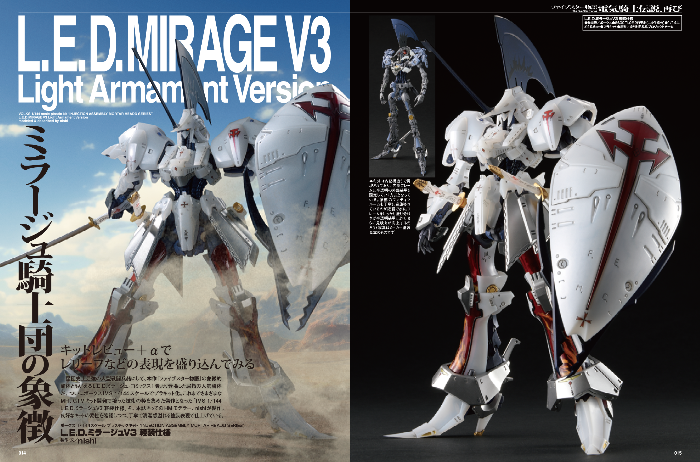 今回の特集では、プロモデラー・nishiが担当した最新キット「L.E.D.ミラージュV3 軽装仕様」のキットレビューを掲載。キットの詳しい解説に加え、レリーフなどの表現を盛り込んで製作しております。