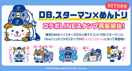 「横浜DeNAベイスターズ」の大人気マスコットキャラクター「DB. スターマン」とインクルーズの大人気スタンプ「面倒だがトリあえず返信」の「めんトリ」がコラボした「DB. スターマン × めんトリ」LINEスタンプ。ユニフォームデザインの変更に伴い、【株式会社インクルーズの販売アカウント】から再配信を開始!横浜DeNAベイスターズ及び「DB. スターマン」のファンの方も、「めんトリ」のファンの方もご活用ください!