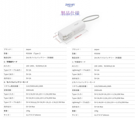 シン三海株式会社(本社:大阪府堺市堺区、代表取締役:伴場 義通)は、楽天市場 公式店舗「SINSANKAI」にて、モバイルバッテリー zepan PD50W の販売を、2023年8月3日に開始しました。zepan PD50W はコンパクトでかわいい本体に、PD22.5Wの急速充電機能、折り畳み式プラグの内蔵、低電流モード搭載、スタンド機能、電池残量表示といったモバイルバッテリーとして求められる機能を搭載。女性のポーチやミニバッグに最適なお出かけ時の必需品です(鑫三海株式会社はzepan PD50Wの日本総代理店です)。