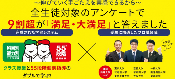 四谷学院は「55段階個別指導」や「科目別能力別クラス授業」が特徴的ですが、この学習システムを最大化しているのは、講師陣の質の高さです。生徒アンケートでは、92.8%の生徒が「満足」「大満足」と答えました(※資料1)。理由は以下の通りです。