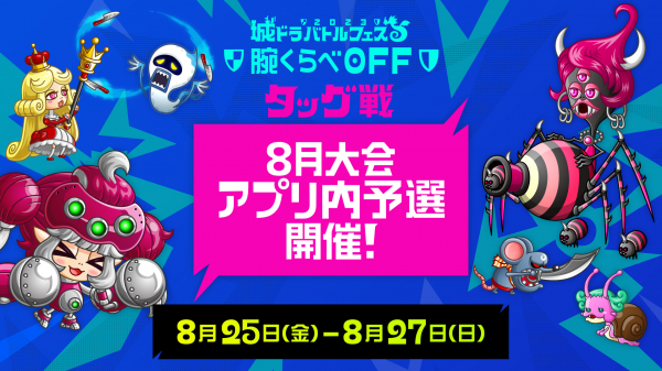 8月25日(金)より、『城ドラ』プレイヤー王者決定戦「城ドラバトルフェス2023」の腕くらべOFFモード・タッグ戦8月大会アプリ内予選を開催いたします。8月大会で勝ち進んだベスト10チーム、7月大会で勝ち進んだベスト10チームが、9月10日に行われるトーナメント戦でそれぞれ1チームに絞られ、決勝戦として12月に予定されている「タッグ王者決定戦」に進出することができます。予選へのご参加、心よりお待ちしています!予選へのご参加、心よりお待ちしています!