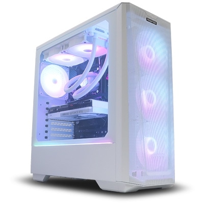 ケースファン4基と水冷CPUクーラーが備える2基のファンを合わせた計6基のファンに加え、ケース側面に施したRGB-LEDラインが色鮮やかに光る煌びやかな外観です。すべてのLEDは、ケース上部のボタン制御だけで容易に点灯のON/OFFや発光パターンを変更することができるため、光るゲーミングPCが初めての方でも安心です。