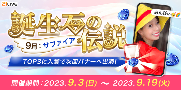 株式会社エムアンドティーティー(本社:沖縄県北谷町、代表取締役:井藤 三知子)が運営するエンターテイメント・ライブ配信アプリ【21LIVE(ニーイチライブ)】URL: https://21.live は、9月3日(日)から9月19日(火)にかけてランキングイベント「誕生石の伝説」を開催。9月の対象アイテム・サファイアの獲得数に応じて順位を決定いたします。