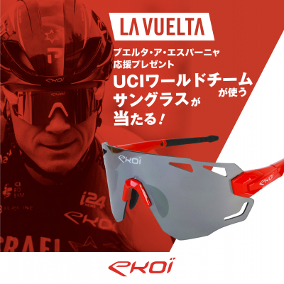 サイクリングウェアブランド「EKOI(エコイ)」がサポートする選手も多数出場中のブエルタ・ア・エスパーニャ2023。選手の活躍を応援するために公式インスタグラムアカウントのフォロワーの方へ抽選で1名様にUCIワールドツアーチームの選手も使用しているサイクリング用サングラス「PUREMIUM 70」をプレゼントいたします。