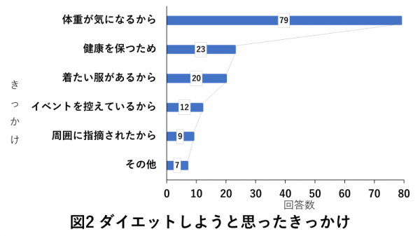 最も回答が多かったのは、回答数79名の「体重が気になるから」という理由。周囲に指摘されてからダイエットに取り組む女性よりも、自主的にダイエットに取り組む女性の方が多いようです。