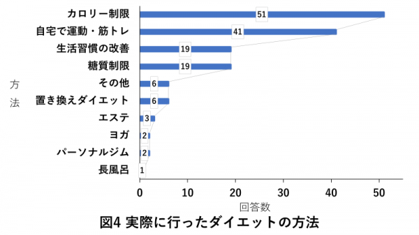 実際に行ったダイエット方法のうち、カロリー制限を行っていたという女性や自宅での運動を行っていた女性が多くみられました。