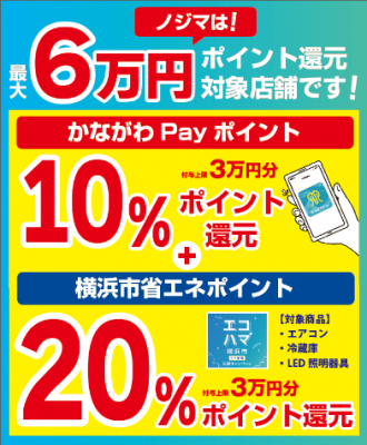ノジマはかながわPay加盟店のため、エコハマと併用することが可能です!エコハマキャンペーン最大20%還元(上限3万円分)に加え、かながわPay最大10%還元(上限3万円分)を受けることができるため、合わせて最大6万円分のポイントを享受することができます。