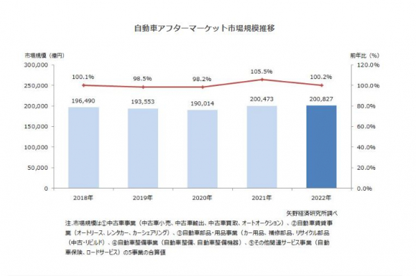 2022年の自動車アフターマーケット市場規模は、前年比100.2%の20兆827億円と推計した。2022年調査時と比較して中古車販売市場が大きく落ち込んだ。