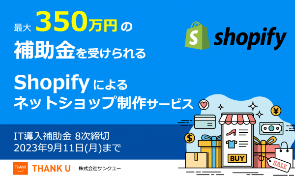 株式会社サンクユー(東京都品川区、代表取締役社長:堀川治)は、2023年8月28日、最大350万円のIT導入補助金の交付申請が可能な「Shopifyによるネットショップ制作」8次締切分を開始いたしました。