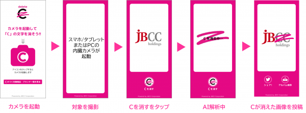 JBCCホールディングスは、この活動に多くの人がより気軽に参加できるよう「C」を消すオリジナルのWebアプリを開発し、無償で提供します。このアプリはスマートフォンやタブレット、モバイルPCなどのカメラと連動し、アプリを使って撮影した画像内に含まれる「C」の文字をAIが認識して自動で消します(対象はJBCCホールディングスの社名ロゴおよび「#deleteC大作戦」協賛企業の対象商品・対象ブランド)。「C」が消された画像はその場で簡単にSNSに投稿することが可能です。