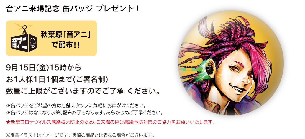 また弊社秋葉原店舗「音アニ」にて9月15日(金)15:00より「A4クリアファイル」の販売と同時に実機展示を実施致します。本モデルに搭載される録り下ろしボイスや音質の確認が可能で、店頭設置の専用QRコードにてご予約も可能です。ご来店特典として、オリジナル缶バッジの配布をさせていただきます。ただし、こちらは数量に上限がございますので配布はお1人様1日1個、無くなり次第終了となります。