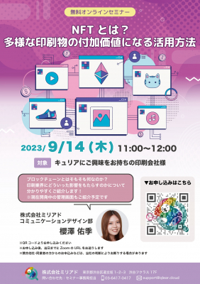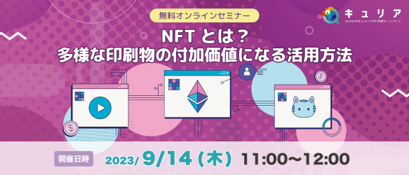 スマホコンテンツ制作ツール「キュリア」を運営する株式会社ミリアド(本社:東京都渋谷区、代表取締役CEO:樋口 清政)は、2023年9月14日(木)AM11時から印刷業界向けに 【NFTとは?多様な印刷物の付加価値になる活用方法】 と題した無料オンラインセミナーを開催することをお知らせいたします。