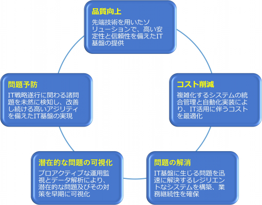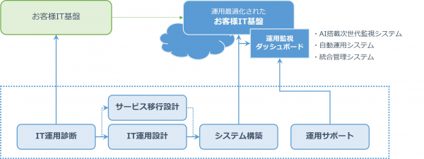 ITサービスマネージメントにおけるベストプラクティスをフレームワークとして体系化した、ITILベースのシステム運用診断・運用設計、AWSなどクラウド環境の最適化、AI搭載次世代監視システムによる自動モニタリングの実装、運用自動化、システム統合管理ダッシュボードの実装といったソリューションを通じ、適正なコストと柔軟な対応によって、お客様の環境に最適化されたIT戦略基盤の導入・運用を実現します。
