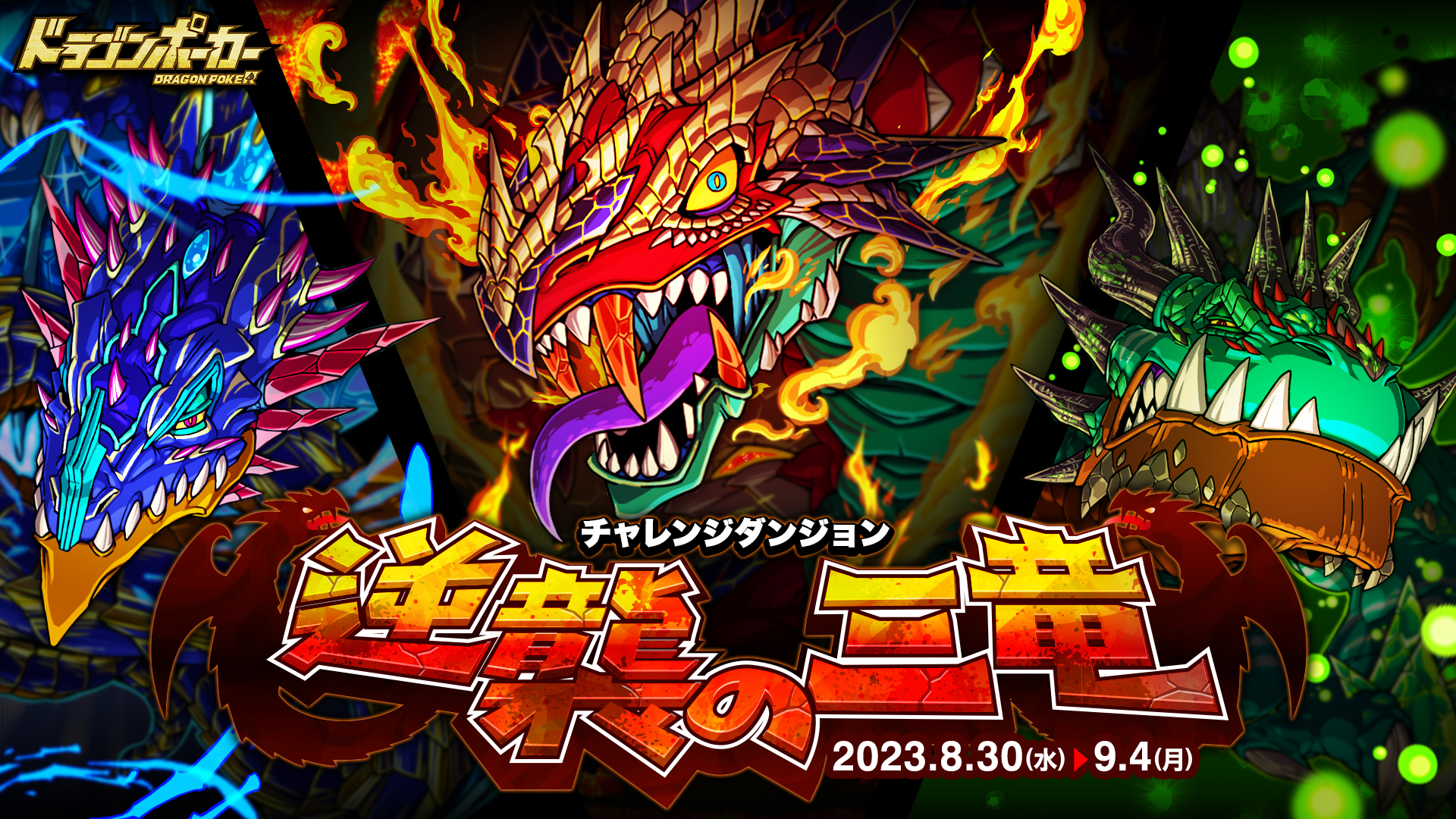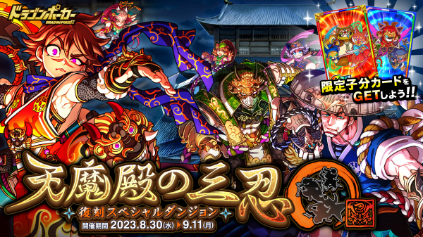 株式会社アソビズム(本社:東京都千代田区、代表取締役:大手智之)は、App Store・Google Playにて好評配信中のリアルタイム合体カードバトル『ドラゴンポーカー』で、2023年8月30日(水)より復刻スペシャルダンジョン「天魔殿の三忍」を開催いたします。