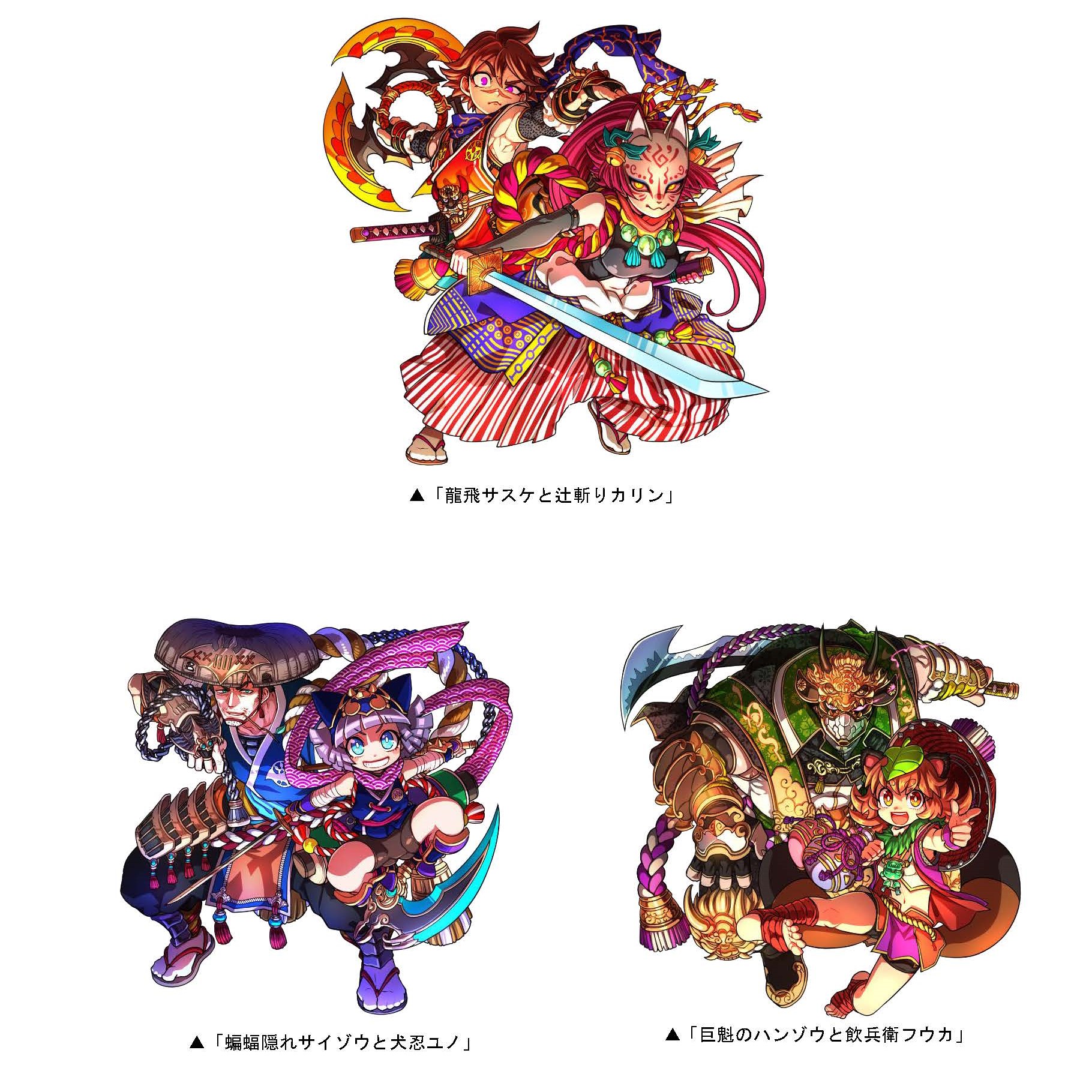 本ダンジョンには、新たに「龍飛サスケと辻斬りカリン」「蝙蝠隠れサイゾウと犬忍ユノ」「巨魁のハンゾウと飲兵衛フウカ」などが出現し、クリアした回数に応じて竜石を手に入れることができます。