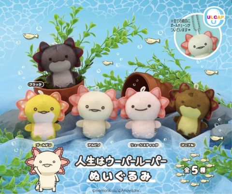 今回は「人生はウーパールーパー」シリーズの主要キャラクター、アルビノ・リューシスティック・マーブル・ゴールデン・ブラックの全5種展開。ボールチェーンが付いているので、カバンなどに付けてお出かけにも連れていくことができます♪