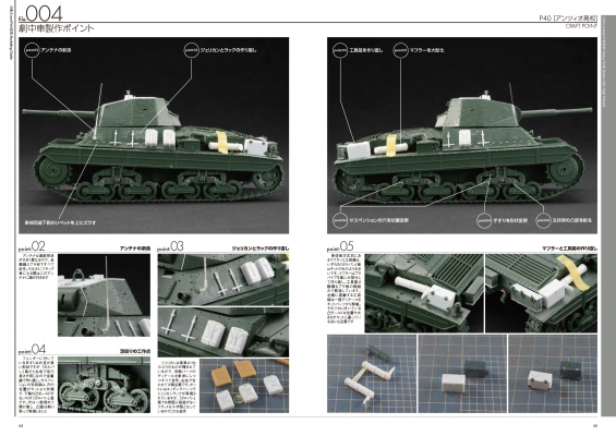 収録車輌は「ティーガーI」「シャーマン(75mm砲)」「T-34/85」「IS-2」「P40」「センチュリオン」。前刊「ガールズ&パンツァー マスターモデリングガイド」と合わせることで、主要な隊長車をコンプリートできます!