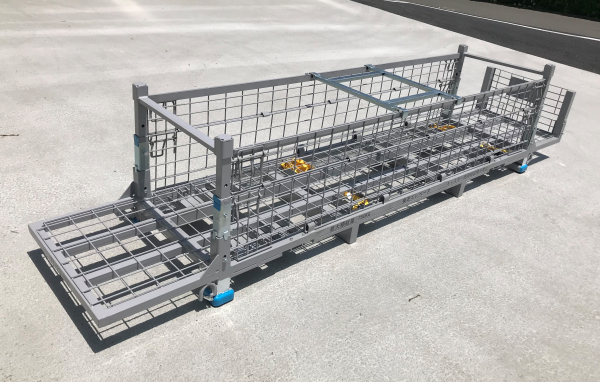 長さ3m以上ある長尺鋼材製品は、台木を挟んでバラ積みで保管・荷役されていましたが、荷役・輸送時の落下や荷崩れ、製品キズ等のリスクがありました。そこで、運搬時の安全性、製品のベルト固定、キズの防止を実現したリターナブルコンテナを開発しました。このコンテナは、「製品が出し入れしやすい両側面の花開き構造」「現地搬送を考慮した着脱式のキャスター」「高さ可変構造による収納量に合わせた保管輸送の効率化」といった機能を搭載しています。また、トラック積載時には、段積みや3列並べることも可能な、高い積載効率を有したスマートコンテナです。