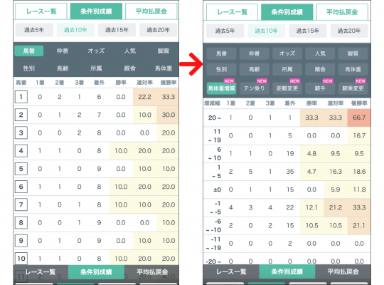 このたび、レース配下に過去10年の「条件別成績」データを新たに5項目追加し、全15項目へと拡充いたしました。新たに「馬体重増減」「テン乗り」「距離変更」「騎手」「騎乗変更」を追加したことで、過去データからより詳しい条件下での1~3着数、勝率・連対率・複勝率をご確認いただくことができます。まだ会員登録がお済みでない方は、ぜひこの機会にご登録いただき、より便利になった SPAIA競馬 をお愉しみください。