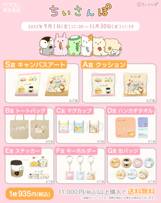 S賞のキャンバスアートは一辺30cmと迫力のサイズでかわいいイラストを存分に楽しめます!A賞は一辺45cmの大きなクッション、B賞には大き目サイズで使いやすいトートバッグ、C賞以降も普段使いしやすいハンカチタオルやマグカップなど充実のラインナップ!