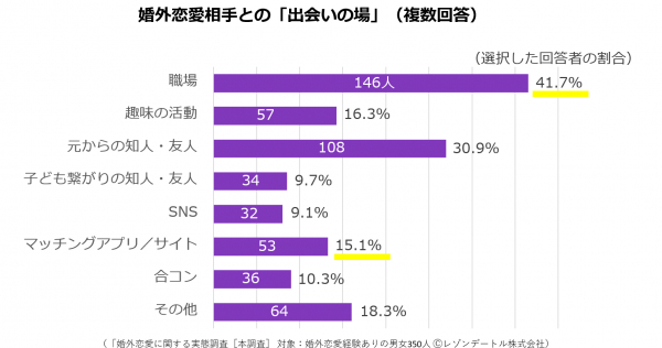 扶桑社の週刊SPA!編集部が2012年に既婚男女200人を対象として行った「不倫相手との出会いの場」アンケート調査(2012年、https://nikkan-spa.jp/168217)でも職場が1位で40%(男性40%、女性36%)と同じ数字が出ているため、「職場が4割」はかなりの信憑性がありそうです。