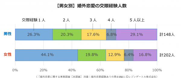 婚外恋愛経験者たちは、これまでに何人の婚外パートナーと付き合ってきたのか──。調べてみると、男女で大きな違いがありました。男性で最も多い交際人数は「5人以上」で3割近くにも上るのに対して、女性は4割以上が「1人だけ」と回答したのです。