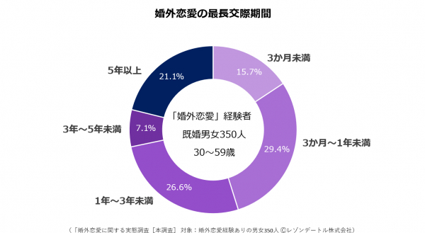 婚外恋愛の交際期間はどれくらいか──。お互い自由に会えない状況であり齟齬も多いと考えられるため、「短期間が多い」と想像されますが、実態はどうでしょうか。「過去最長の交際期間」を尋ねてみました。