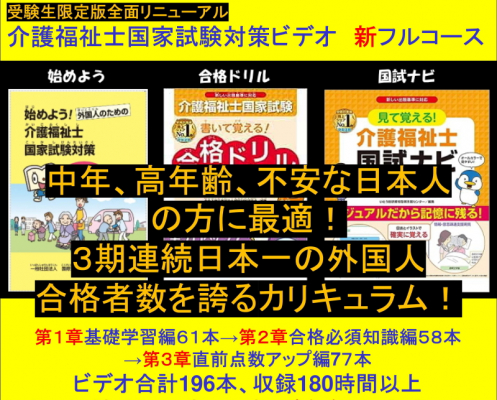 中高年向けにも最適、受験生個人限定販売の一発合格「介護福祉士試験対策講義ビデオフルコース新」