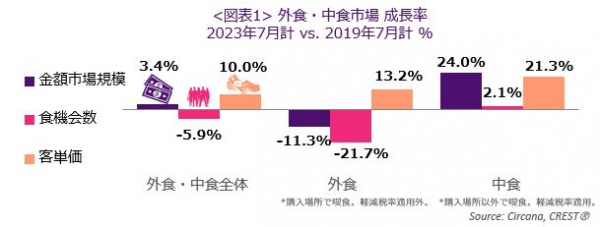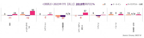 外食・中食市場の2023年7月は、売上3.4%増(2019年同月比)