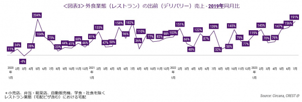 外食業態計(レストラン計)の出前(デリバリー)売上2019年同月比をみると(図表3)、プラス成長が続いています。デリバリー増加のピークは2020年5月の204%増ですが、その後も2ケタ増が続いています。2023年7月は3ヶ月連続の3桁増の同191%増で、2020年5月に次ぐ成長でした。